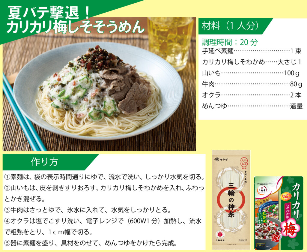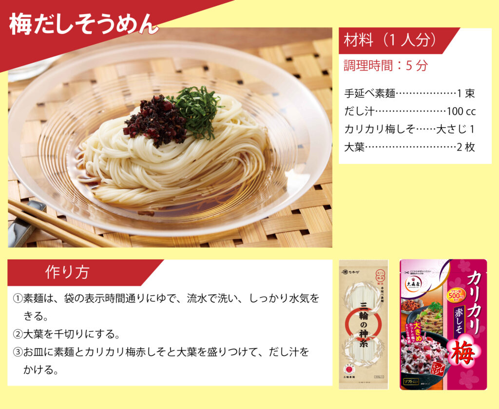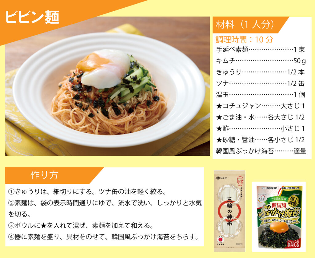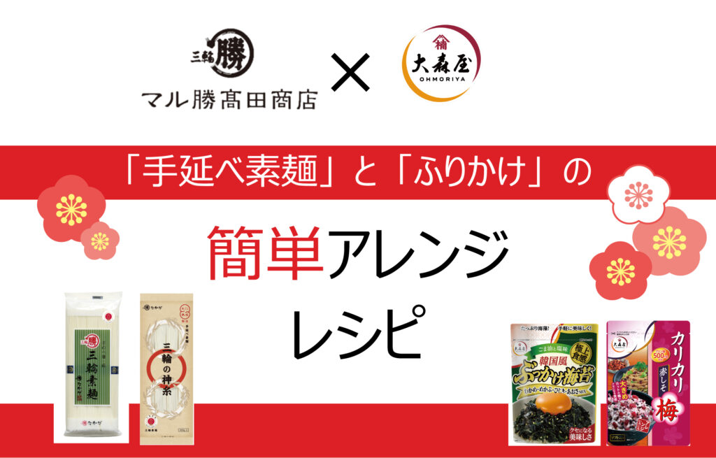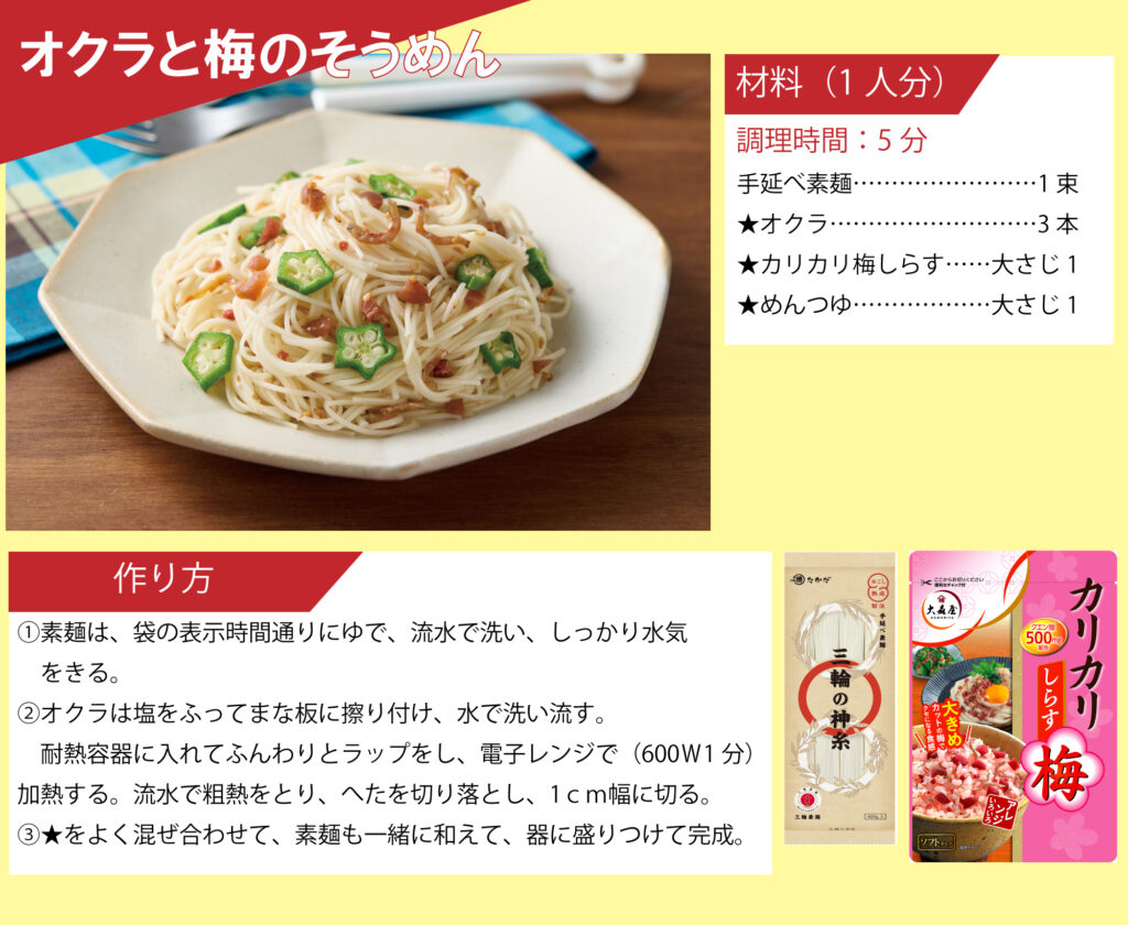 「マル勝高田」と「大森屋」がコラボ!素麺レシピを公開いたします。 目次 オクラと梅の素麺 カリカリ梅そうめん ごま油香るうま塩そうめん そうめんチャンプルー ツナ混ぜ素麺 ビビン麺 ピリ辛油そうめん 韓国風ぶっかけ豆乳素麺 梅だし素麺