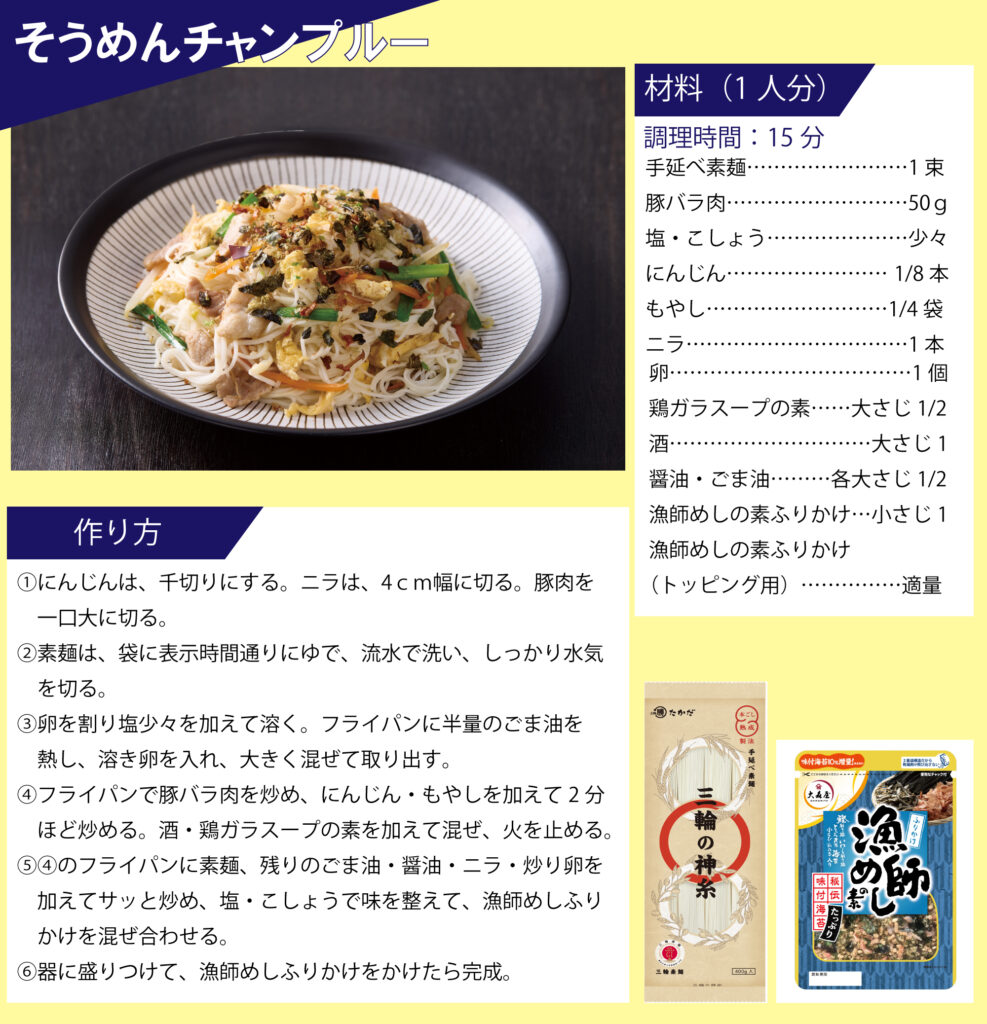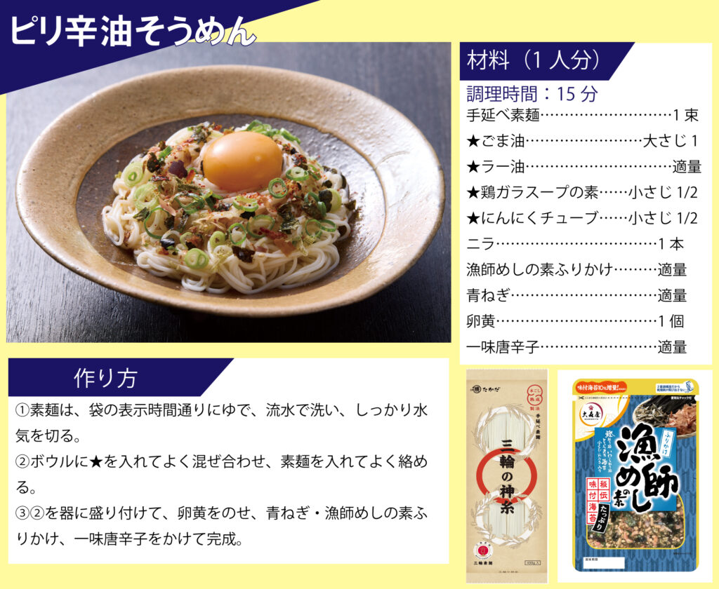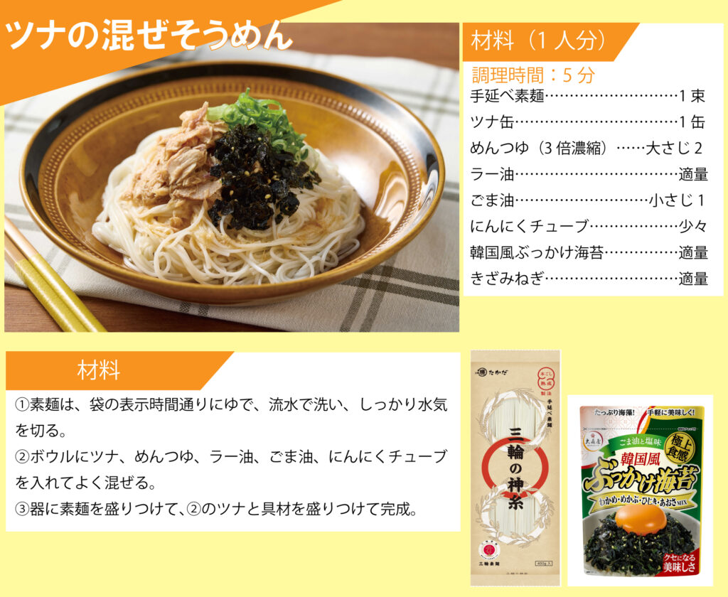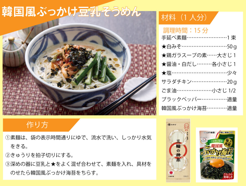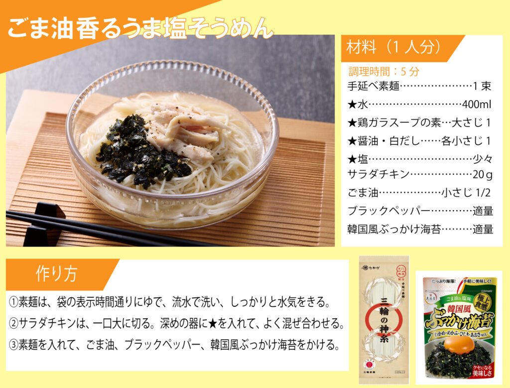 「マル勝高田」と「大森屋」がコラボ!素麺レシピを公開いたします。 目次 オクラと梅の素麺 カリカリ梅そうめん ごま油香るうま塩そうめん そうめんチャンプルー ツナ混ぜ素麺 ビビン麺 ピリ辛油そうめん 韓国風ぶっかけ豆乳素麺 梅だし素麺